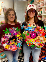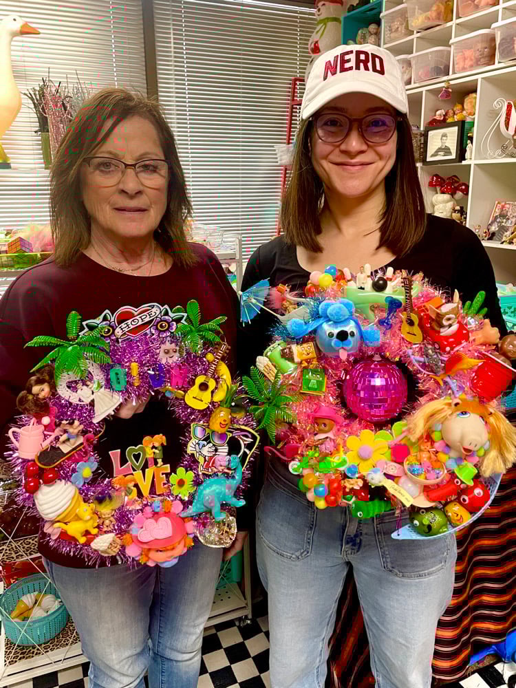 Bins apon bins of vintage and retro pieces from festive birds, happy dinosaurs, to novelty toys and hundreds of vintage, retro and customized items, including plastic animals, monkey faces and doll heads, florals, plastic fruit with custom felt faces and googly eyes, pom poms, felt shapes, bows, trims and so much more will be yours to incorporate into your wreath during the workshop.