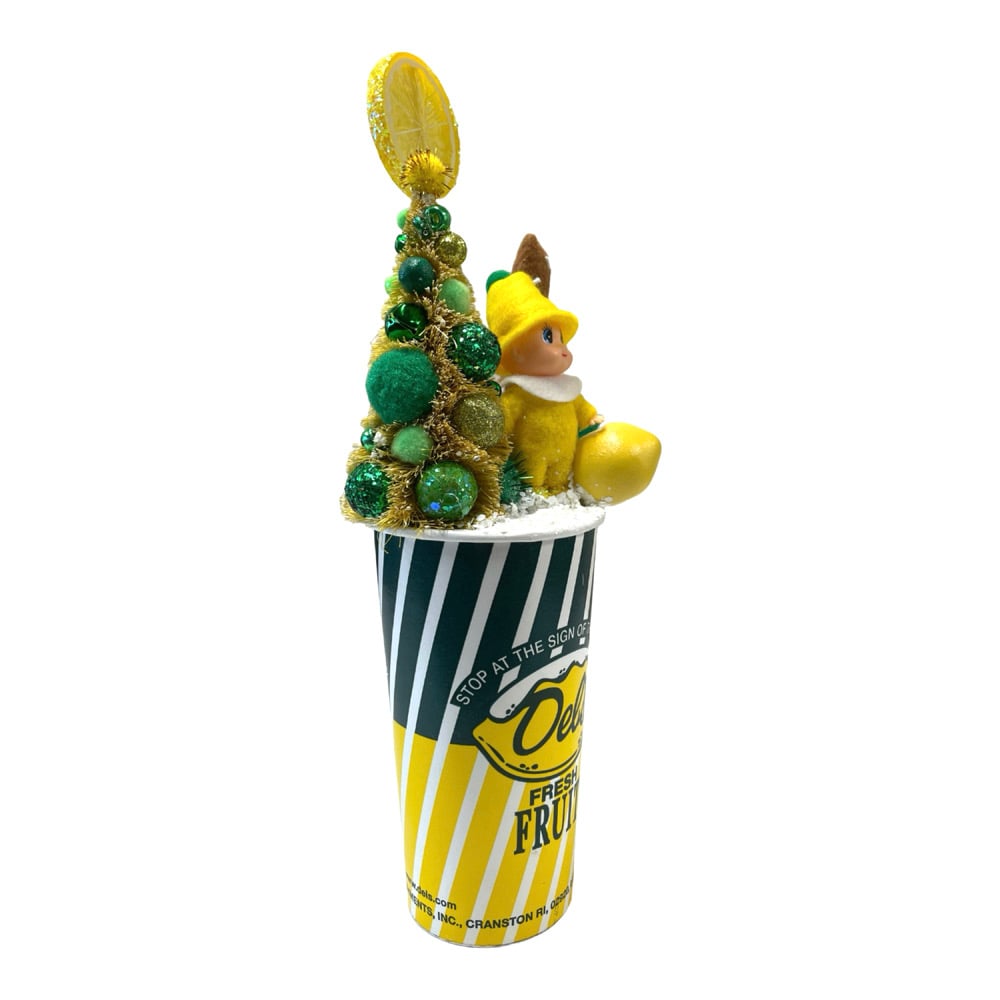 A slice of faux citrus dipped in glitter suspended by striped paper straw over wooden dowel is the backdrop to the festive yellow trees with mini ornaments. I had to include my hand sewn felt pretzel with white bugle bead “salt”. Benny the pixie is dashing in his little yellow handmade felt suit and hat with a tiny green pompom on top.