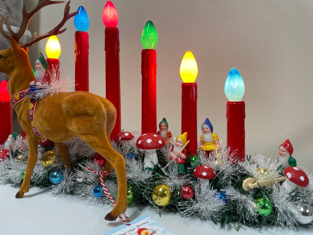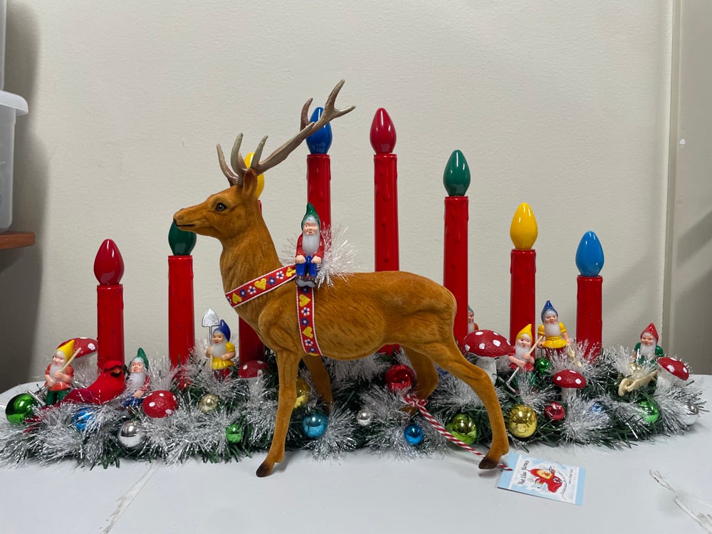 The large flocked deer as well as the gnomes are vintage. They are all wired into the frosted greenery. The hand painted mushrooms, shiny vintage ornaments and a new velvet cardinal are securely glued onto the greenery to create this unique vignette.