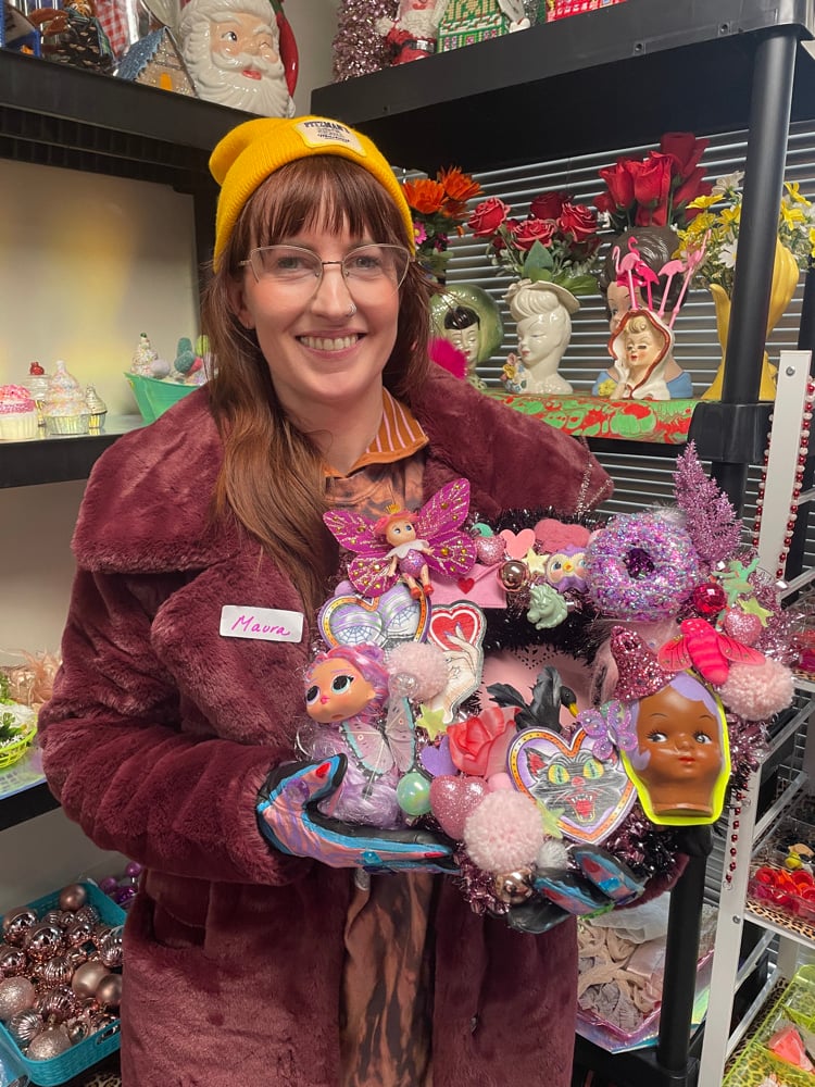 Bins apon bins of vintage and retro pieces from festive birds, happy dinosaurs, to novelty toys and hundreds of vintage, retro and customized items, including plastic animals, monkey faces and doll heads, florals, plastic fruit with custom felt faces and googly eyes, pom poms, felt shapes, bows, trims and so much more will be yours to incorporate into your wreath during the workshop.