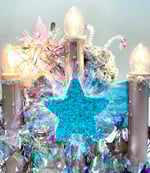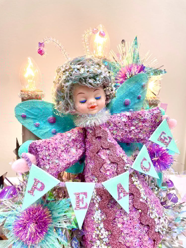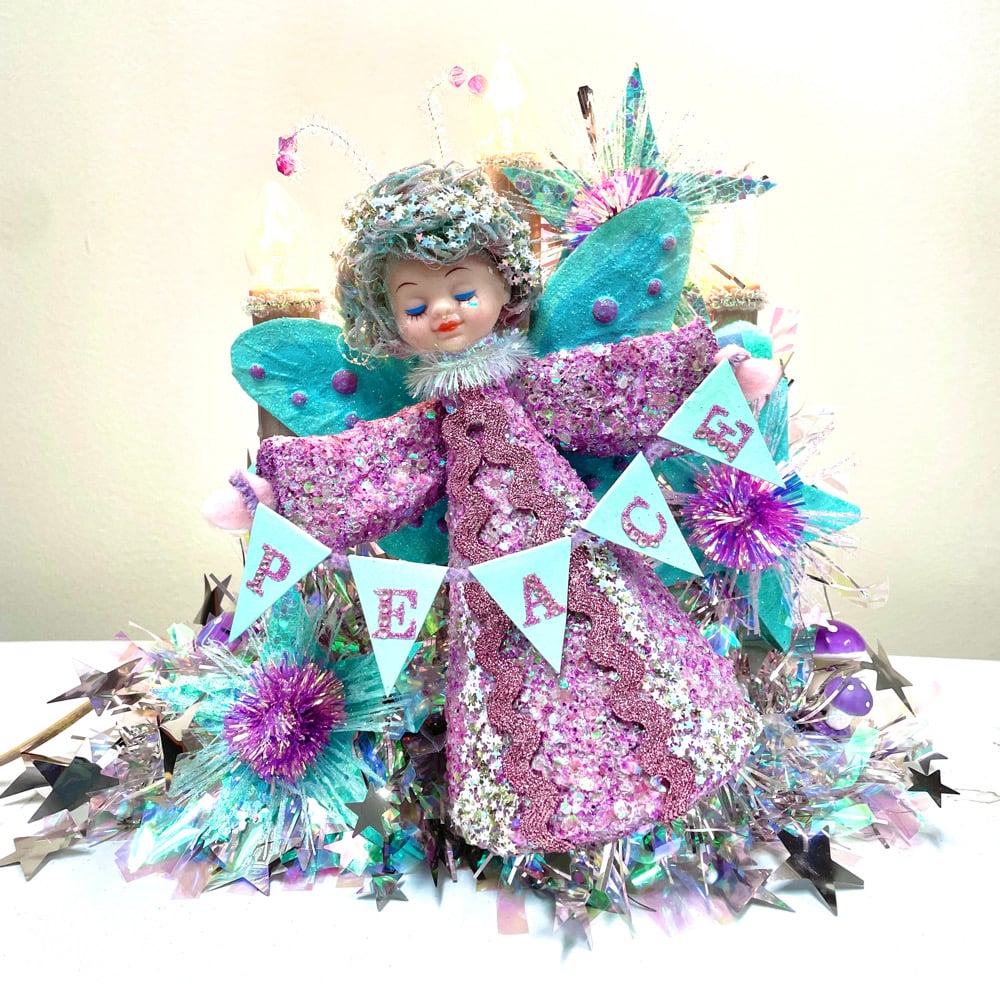 May I present the Peace Moth. She is here to brighten your spirits and to delight your imagination. The Peace Moth Fairy is an upcycled vintage tree angel with customized wings and cut crystal antennas. I created a new glittering robe to complement her sparkling new hair do. Recycled cereal boxes have been transformed into starbursts and stars and a dainty Peace banner to complete this fantastical vignette.