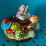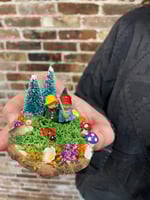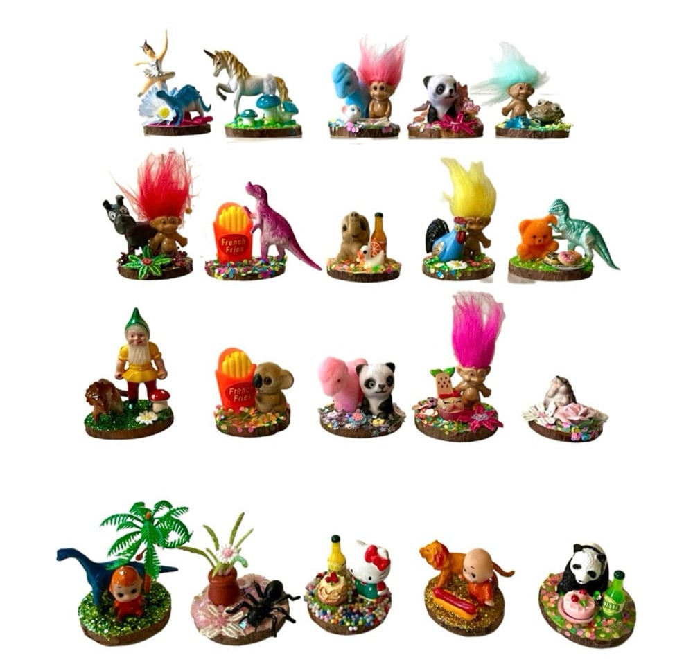 An endless array of miniatures including trolls, cupies, dinosaurs, flocked animals, vintage gnomes, tiny mushrooms, hand dyed bottle brush trees and upcycled custom accents will be available to use in your 3 mini vignettes.